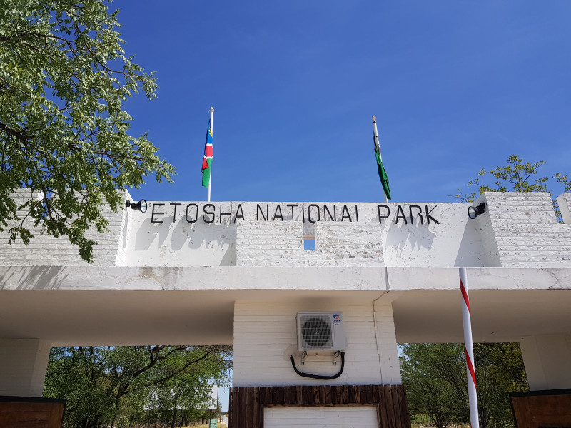 에토샤 국립공원 동쪽 입구, Von Lindequist Gate 사진 속 게이트를 지나서 에토샤 국립공원으로 들어왔다. 어마어마한 크기의 국립공원이다. 우리는 동쪽 입구(Von Lindequist)를 지나서 캠핑 장소로 예약한 Okaukuejo로 향했다. 가는 길 자체가 게임 드라이브(사파리)였다. 국립공원을 관통하는 주도로는 잘 정리를 해놓았고, 일부 물웅덩이(Waterhole)로 이동하는 길은 거칠었지만, 전체적으로 길을 좋다. 공원 내 규정속도는 60Km/h이지만, 주도로에서는 80~100Km/h 달릴 수 있을 정도였다.