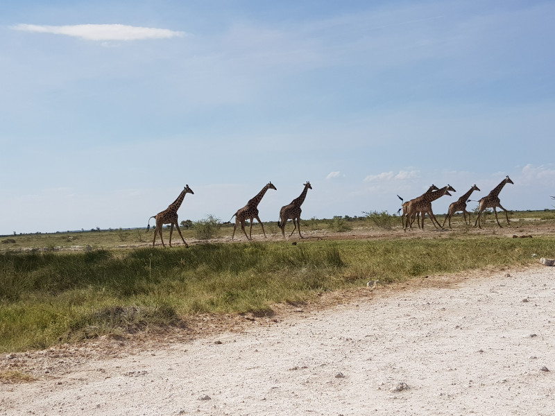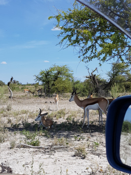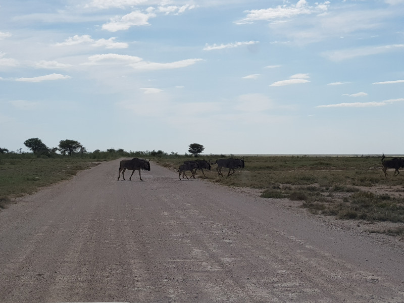 에토샤 국립공원 내부 도로(에토샤 국립공원, Etosha National Park) 이곳에서 제일 흔한 건 스프링복과 얼룩말이다. 몇 시간을 돌아다니다보니 스프링복과 얼룩말은 너무 자주 보게 되어서, 길에서 마주치더라도 차를 멈추지 않는 경우도 많았다. 그 외에도 와일드비스트(물소), 기린, 코끼리 등을 만날 수 있다.