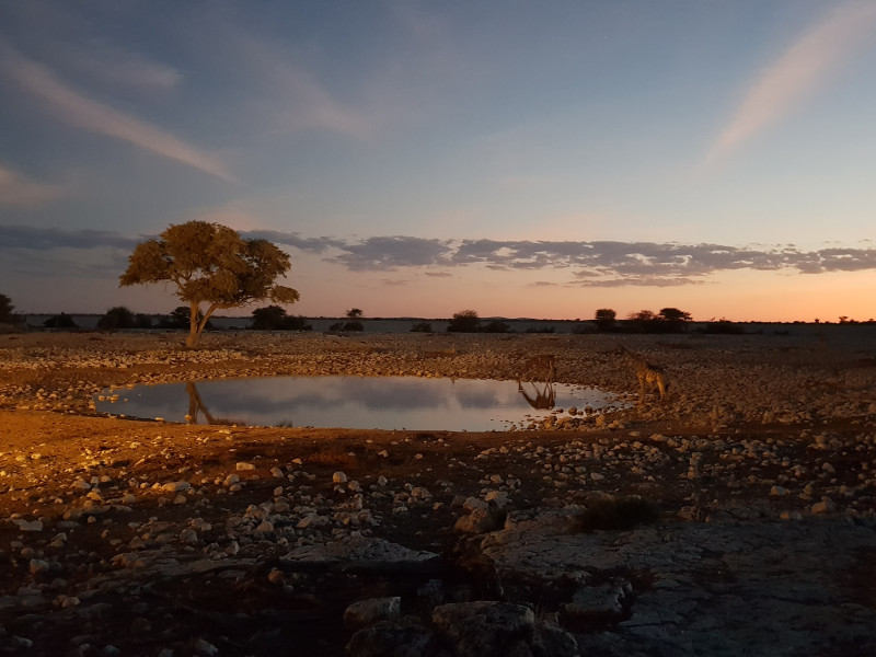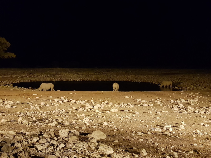 에토샤 국립공원 안에 있는 몇몇 롯지(Lodge)들은 사실상 독과점 운영체제이다. 국립공원이 일출, 일몰시간에 맞춰서 출입문을 통제하는데 그 안에 있는 숙박시설이라는 존재 자체가 넌센스처럼 느껴진다. 그래도 덕분에 야간에 물을 먹으러 오는 동물을 볼 수 있다는 장점이 있다. ‘Okaukuejo’라는 말 자체가 에토샤 국립공원 안에 있는 물웅덩이(waterhole)중에서 가장 큰 물웅덩이를 가리킨다. 야간에는 조명을 켜주는 덕분에 밤에 물을 먹으러 오는 동물을 볼 수 있다. 특히 ‘꽃보다 청춘’에서 유명해진 이곳에서 코뿔소를 볼 수 있었다. 아프리카 생활 4개월만에 드디어 코뿔소를 만나게 된 것이다. 현지인에게 들어보니 이곳에서는 야간에 코뿔소를 자주 볼 수 있다고 한다.