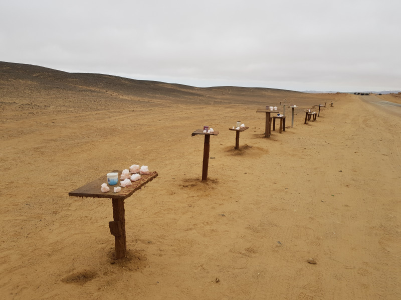 물개해변의 물개들. 이건 일부분에 불과하다. (케이프크로스, Cape Cross) 인근 도로에서는 소금결정을 파는 무인 상점을 볼 수 있다. 가격이 적혀있는 테이블 위에 분홍색 소금 결정과 돈을 내는 통만 덩그러니 자리를 지키고 있다. 재미있는 사실은 이 분홍색 소금결정을 사서 집에 와보니 하얀색이 되어있었다. 참고로 왈비스베이(Walvis Bay)남쪽 어딘가에 이렇게 소금을 만드는 곳이 있다. 우리는 염전의 존재를 몰라서 가질 못했다. 인터넷에서 사진을 찾아본다면 시간을 내서 가고 싶다는 욕망이 생길 것이다.