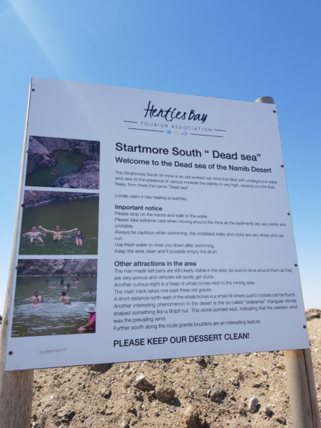 소금결정 (케이프크로스, Cape Cross) 케이프크로스(Cape Cross)에서 1시간정도 거리에 사해(Dead Sea)가 있다. 지도에서 확인하면 멀지 않은 곳이지만 사해로 들어가는 길이 너무 험해서 시간이 오래 걸렸다. 이 곳은 엄밀히 말하자면 바다는 아니다. 과거에 광산이었는데 그 후에 지하수가 차오르면서 여러 가지 염분과 미네랄이 녹아서 높은 염도의 호수(?)가 되었다. 케이프크로스를 방문한 다음에 갈 수 있는데, 시간 여유가 있고 4륜구동 차량을 타고 있다면 가볼만 하다. 하지만 시간 여유가 없고 4륜구동 차량이 아니라면 그냥 지나가도 무방하다.