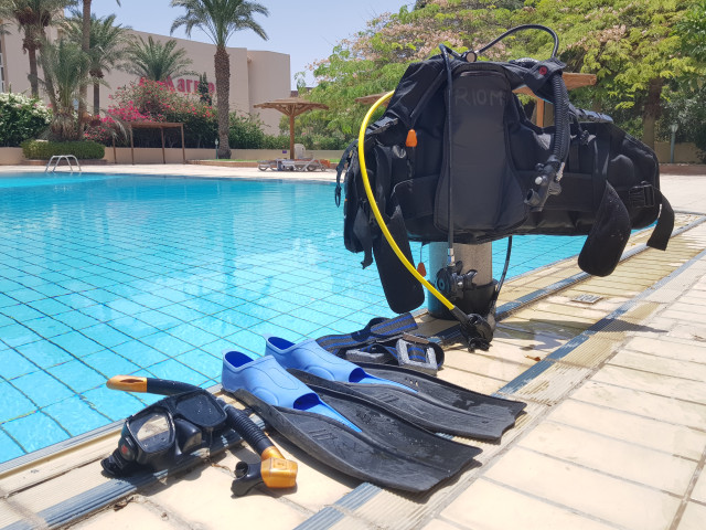 어쨌든 교육을 시작하는 날 하루는 보트 선착장 근처 호텔의 수영장에서 교육을 받았다. 장비 사용법, BCD(부력 조절 기구) 조절하기, 호흡기 찾는 법, 웨이트 탈부착 등등. 수영장은 깔끔했고 이용객도 우리밖에 없어서 편하게 교육을 받았다.