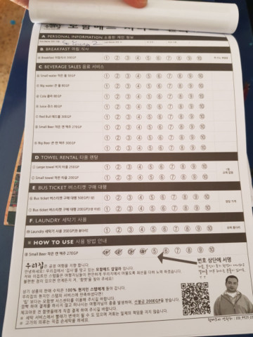 우리집 게스트하우스에서 오랜만에 한식을 먹었다. 이집션 스태프 ‘모하메드’의 요리실력이 대단하다. 아침밥 35EGP, 저녁밥 130EGP. 그 외에 기타 음료, 맥주, 세탁, 버스표 구매 대행 등 여러 가지 도움을 저렴하게 받을 수 있다. 그 중에서도 주류를 쉽게 구하기 힘든 이슬람 국가의 특성 상 맥주를 쉽게 구할 수 있는게 좋다. 나중에 체크아웃 할 때 확인해보니 맥주에 체크한 게 제일 많았다.