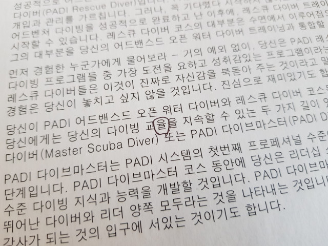 스쿠버 다이빙 교재 2권 교재와 영상의 내용은 어렵지 않다. 몇몇 생소한 단어와 표현에 익숙해지는 데 시간이 필요하다. 가장 큰 애로사항은 번역기를 돌린 듯 한 교재의 부자연스런 번역과 오타, 수 많은 미사여구 때문에 읽어도 핵심파악이 어려웠던 점이다. 그래도 몸으로 익혔던 혹은 익히게 될 내용의 이론을 배우는 것과 PADI라는 단체와 다이버들의 가치관을 간접적으로나마 느껴볼 수 있었던 점은 유익했다.