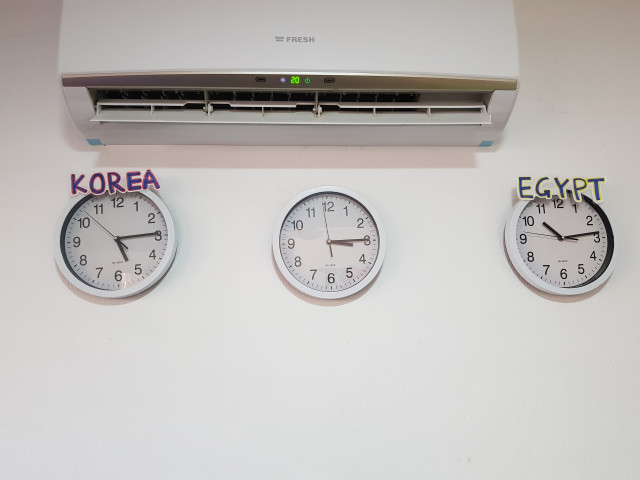 벽걸이 시계들. 가운데 시계는 태국 시각. (후루가다 우리집 게스트하우스)