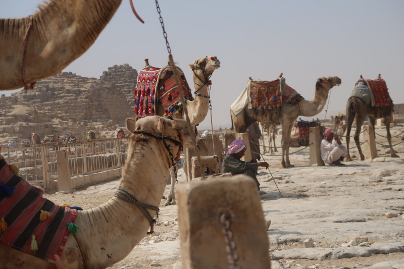 기자 피라미드 구역 안에서 손님을 기다리는 낙타들. (카이로 기자 피라미드, Cairo Giza Pyramids)